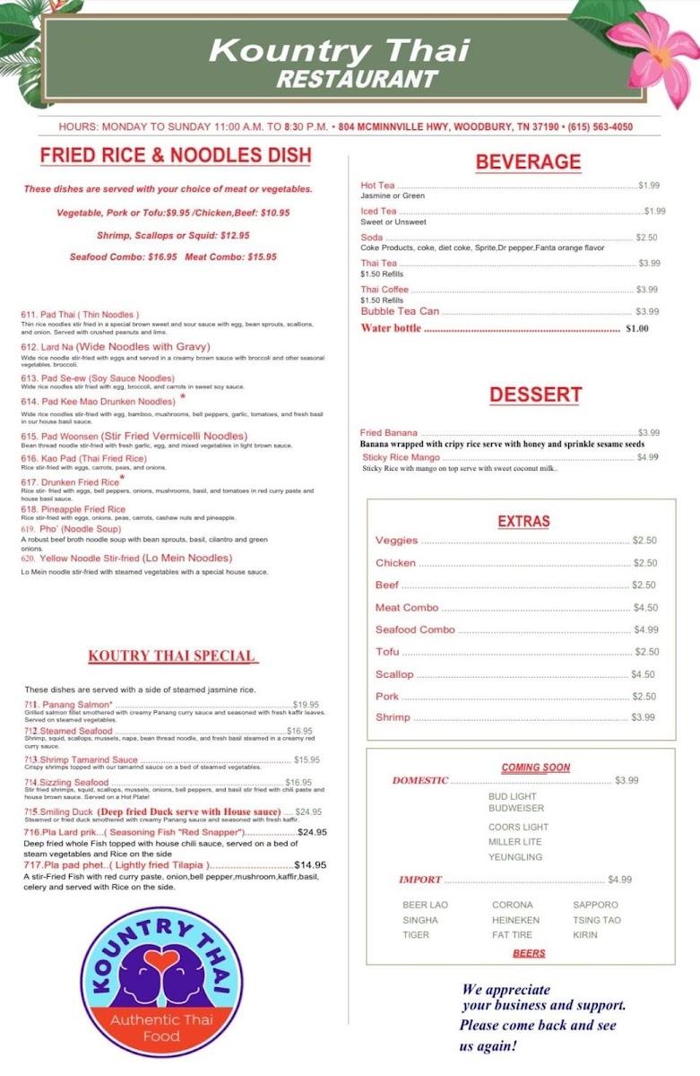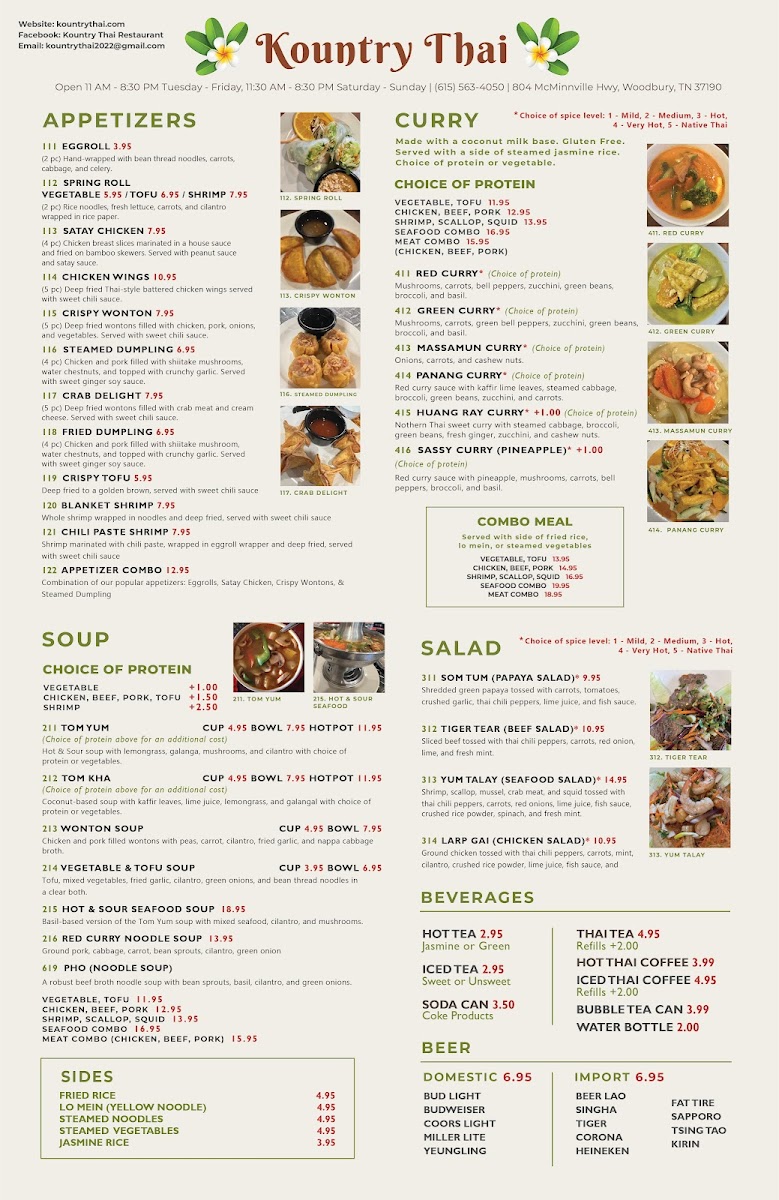 As a diner reviewing the menu of Kountry Thai Restaurant in Woodbury, I’m impressed by how thoughtfully curated and well-balanced it feels, offering both classic Thai favorites and distinctive house specialties. The experience begins strongly with appetizers like Eggrolls, Spring Roll, Satay Chicken, Chicken Wings, and Crispy Wonton, which set the tone with familiar, comforting flavors and crispy textures. The soup selection is equally appealing, from the bold tang of Tom Yum (Hot & Sour) and the creamy richness of Tom Kha (Coconut) to lighter options like Wonton Soup, Vegetable & Tofu Soup, and the flavorful Hot & Sour Soup with Seafood Combo. Freshness continues through the salads, including the vibrant Som Thum (Papaya Salad), the savory Tiger Tear (Beef Salad), the refreshing Yum Talay (Seafood Salad), and the herb-packed Larp Gai (Chicken Salad). Curry lovers are well served with a full range of Thai classics such as Red Curry, Green Curry, Massaman Curry, Panang Curry, and Huang Ray Curry, each offering a different balance of spice, sweetness, and richness. The stir-fry entrées like Pad Kra Pao (Basil Stir Fry), Cashew Nut, Sesame Chicken, Broccoli Delight, and Pad Puk (Mixed Vegetables) provide comforting, everyday Thai flavors, while the noodles and rice dishes-Pad Thai, Lard Na, Pad Se-Ew (Soy Sauce Noodles), Pad Kee Mao (Drunken Noodles), and Pad Woonsen-deliver the familiar tastes most diners crave. What truly elevates the menu are the house specials, including Panang Salmon, Steamed Seafood, Shrimp Tamarind Sauce, Sizzling Seafood, and Pla Lard Prik (Crispy Chili Red Snapper), which feel like signature dishes designed to stand out. Ending the meal with Fried Banana or Sticky Rice Mango, paired with drinks like Thai Tea, Thai Coffee (Iced or Hot), or Iced Tea, creates a complete, satisfying dining experience. Overall, the menu feels diverse, authentic, and well-structured, making Kountry Thai Restaurant a place where both newcomers to Thai food and seasoned fans can confidently find something they’ll love.