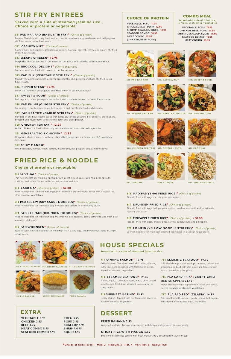 Vegetable or tofu 11.95 Chicken,beef or pork 12.95 Shrimp,scallops or squid 13.95 Seafood combo 16.95 Meat combo 15.95 Fresh Thai basil mango ,onion,carrot,mushrooms, bell pepper,and bamboo shoots
